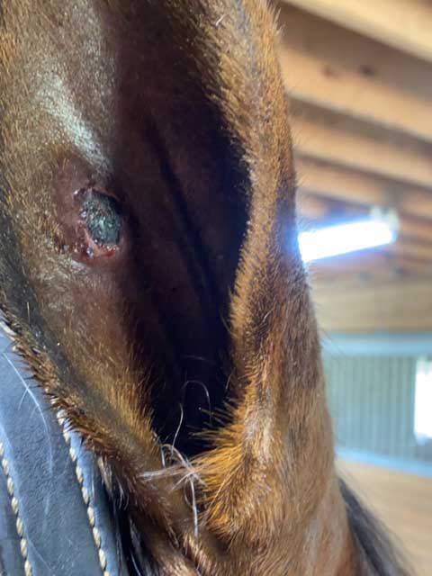 Fresh spider bite infection within a horse’s ear.